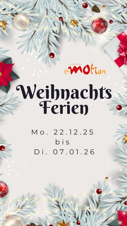 Unser Büro ist in diesem Zeitraum nicht besetzt Sie erreichen uns ab Mittwoch, den 07.01.2026 zu den gewohnten Zeiten. Gerne können Sie uns eine Nachricht per Mail - info@tanzstudio-emotion.de hinterlassen.